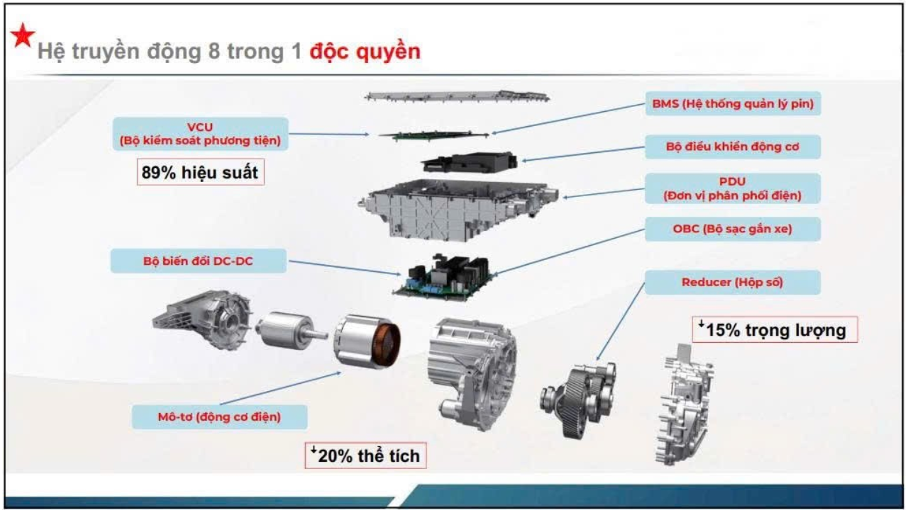 | Hệ truyền động | 8 trong 1 tích hợp | Motor + inverter | Motor + pin module |