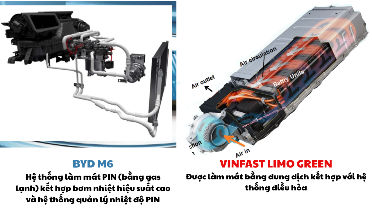 BYD M6 có bơm nhiệt hiệu suất cao, tiết kiệm điện hơn khi dùng điều hòa, đặc biệt trong thời tiết lạnh. Limo Green không có bơm nhiệt nên tiêu thụ điện nhiều hơn.