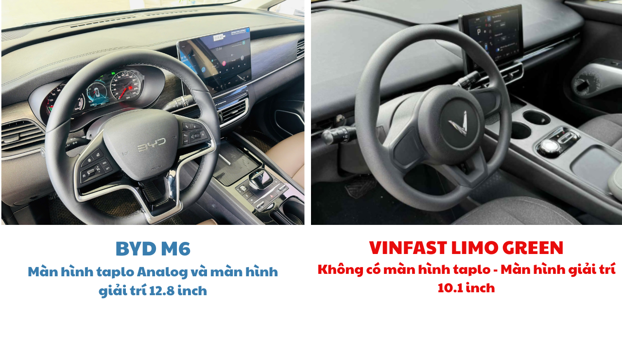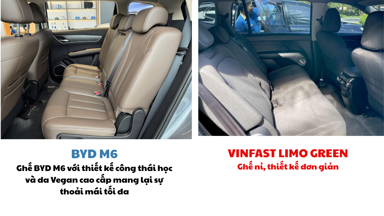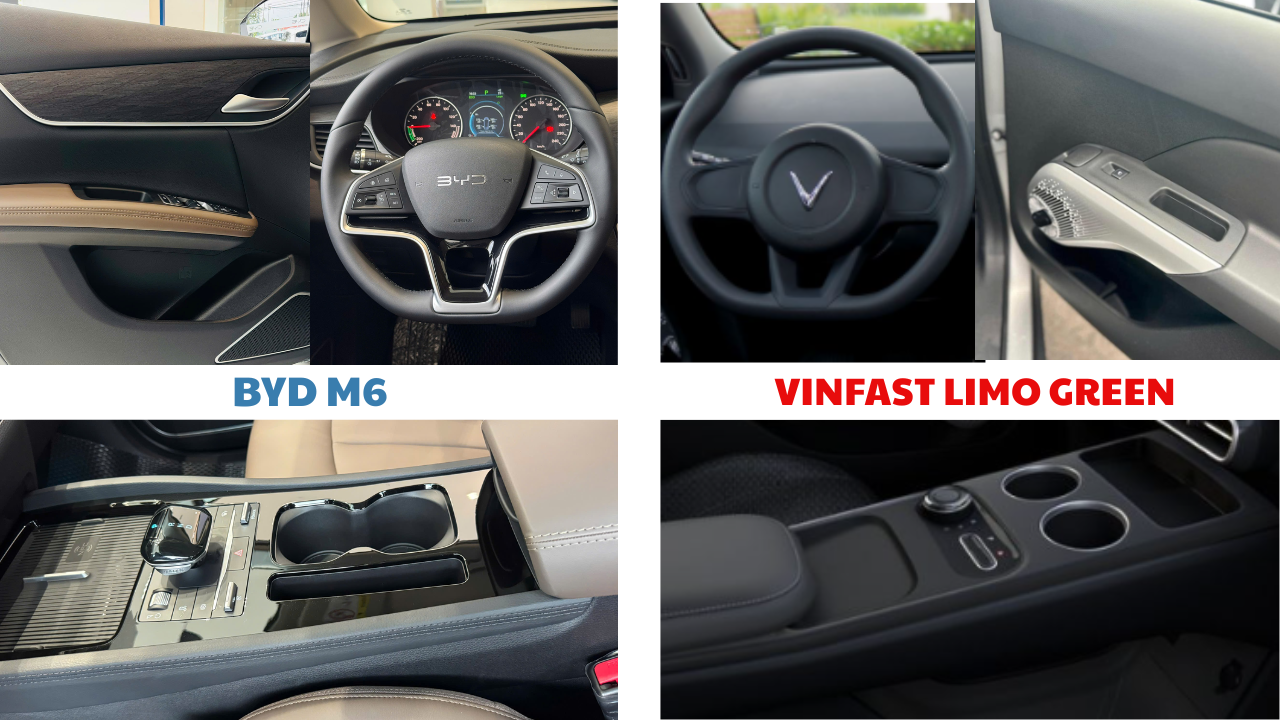 VinFast Limo Green: Nội thất tập trung vào độ bền và dễ vệ sinh, sử dụng chủ yếu nhựa cứng và nỉ. Thiết kế đơn giản, tối ưu không gian chứa đồ và dễ bảo dưỡng, nhưng thiếu sự tinh tế và cảm giác sang trọng so với BYD M6.