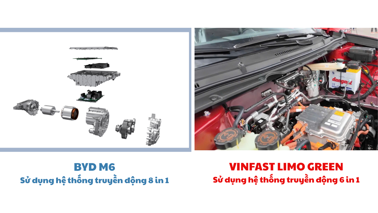 2. Hệ truyền động 8-in-1 của BYD M6 có ưu điểm gì so với 6-in-1 của Limo Green?