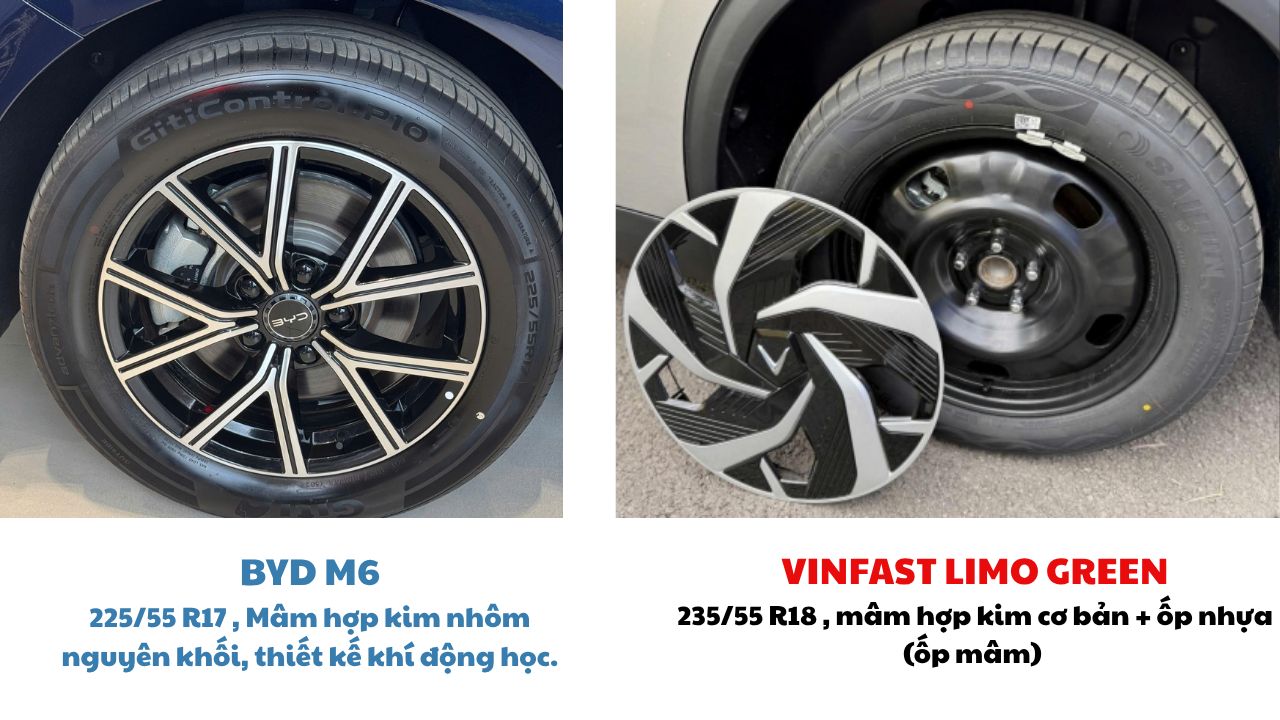 VinFast Limo Green: Dùng mâm + ốp nhựa, chi phí thay rẻ hơn nhưng kém sang và kém bền hơn.