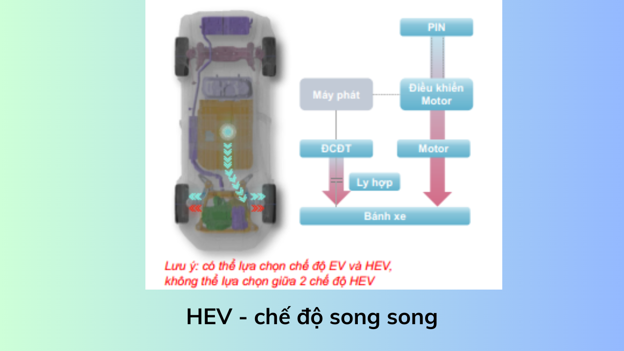 | Loại hybrid | Plug-in Hybrid (ưu tiên EV) | Hybrid nối tiếp + song song | Hybrid series-parallel | Plug-in Hybrid đa cấp (DHT) |